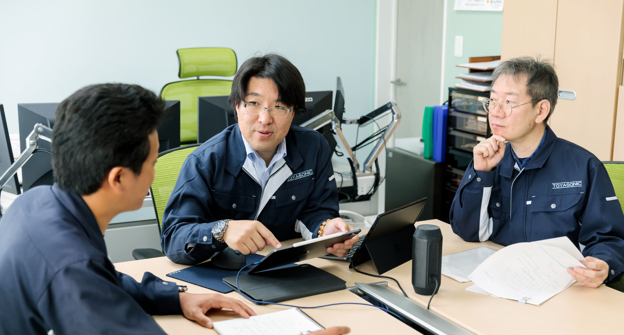 トヤソニックで働くスタッフは、問題解決のために何度も何度も試験を繰り返し、辛抱強くトライし続ける負けず嫌い集団。あなたのアイディア・力を遺憾なく発揮してください。